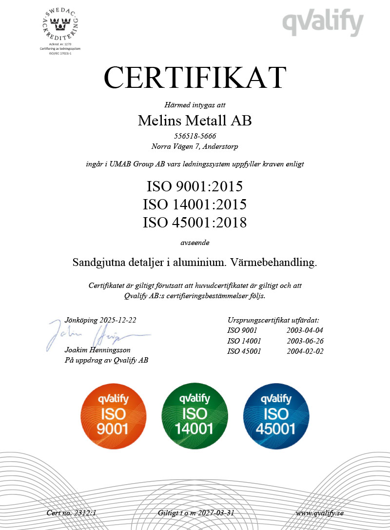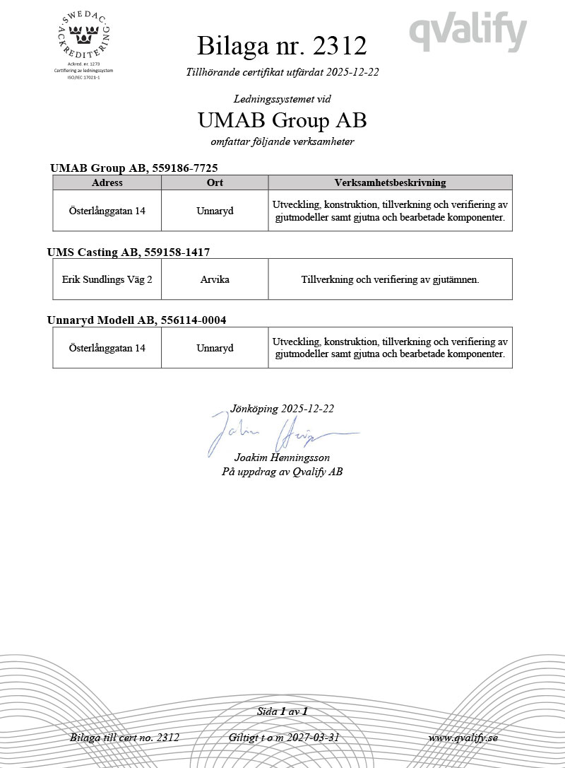 På UMAB Group är vi stolta över att vara en ledande industripartner med specialisering inom utveckling, tillverkning och metallurgi. Med fokus på innovation och hållbarhet verkar vi genom våra tre specialiserade dotterbolag: Unnaryd Modell, UMS Casting och Melins Metall. UMAB Group består av följande företag, var och en med sin unika expertis: På UMAB Group är vi dedikerade till att supporta våra kunder genom hela produktlivscykeln. Från den första prototypfasen, där vi hjälper till att förverkliga koncept och idéer, vidare till förserieproduktion och serieproduktion, står vi vid din sida. Vi erbjuder också support för reservdelar och tillbehör, vilket säkerställer att dina produkter har den bästa möjliga livslängden och effektiviteten. Vårt engagemang och vår expertis innebär att vi kan guida och stötta dig genom varje steg, oavsett var i processen du befinner dig. Med UMAB Group som partner kan du känna dig trygg med att få professionell hjälp från start till mål. Här hittar du våra aktuella certifikat för Umab Groups bolag Unnaryd Modell, UMS Casting och Melins Metall. Klicka på respektive certifikat nedan för att ladda ner och ta del av våra kvalitetssäkringar, miljöåtaganden och standarder. Letar du efter en pålitlig partner med teknisk expertis inom metallurgi, gjutning eller bearbetning? Kontakta UMAB Group idag för att se hur vi kan stödja ditt företag med skräddarsydda lösningar. Knowledge Making Difference